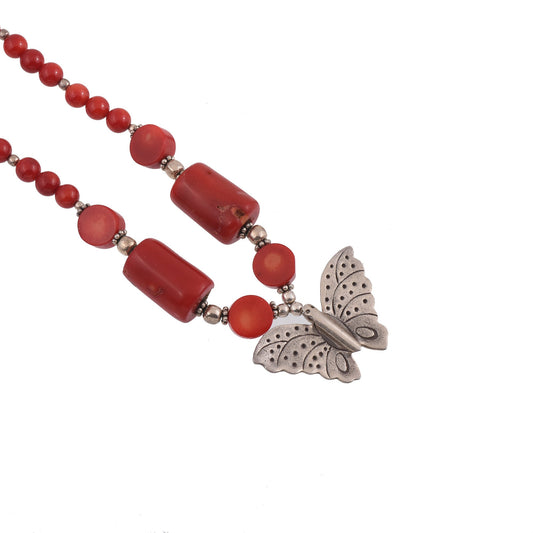 Real Red stone Necklace with Silver Butterfly