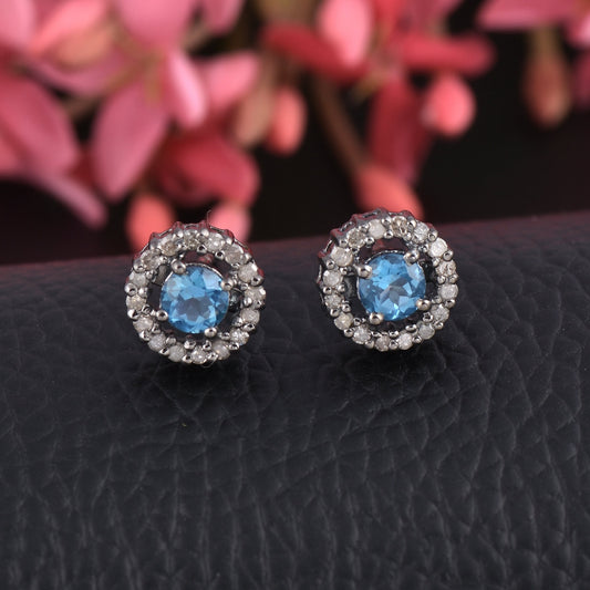 Silver Blue Topaz Diamond Halo Earrings
